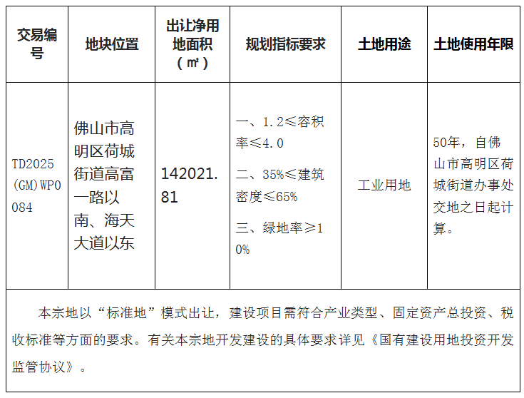 本块地其他规划建设要求按《高明区土地使用规划条件》(佛规明设函〔2025〕0131号)执行。