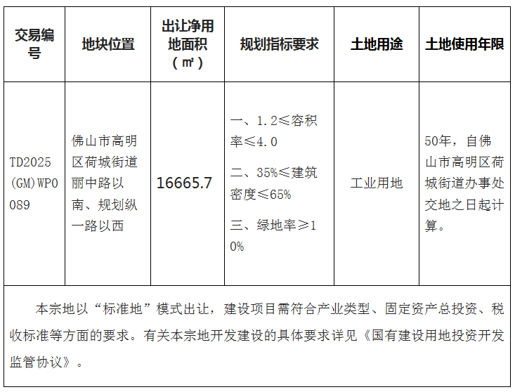 本块地其他规划建设要求按《高明区土地使用规划条件》(佛规明设函〔2025〕0134号)执行。