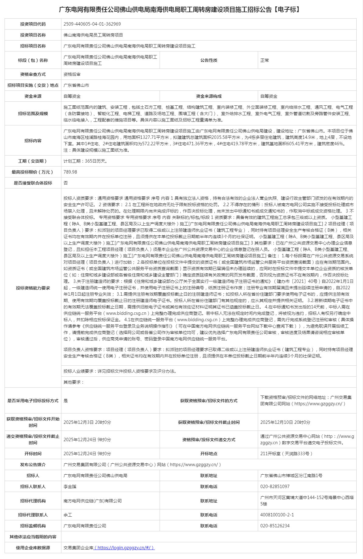 广东电网有限责任公司佛山供电局南海供电局职工周转房建设项目施工招标公告