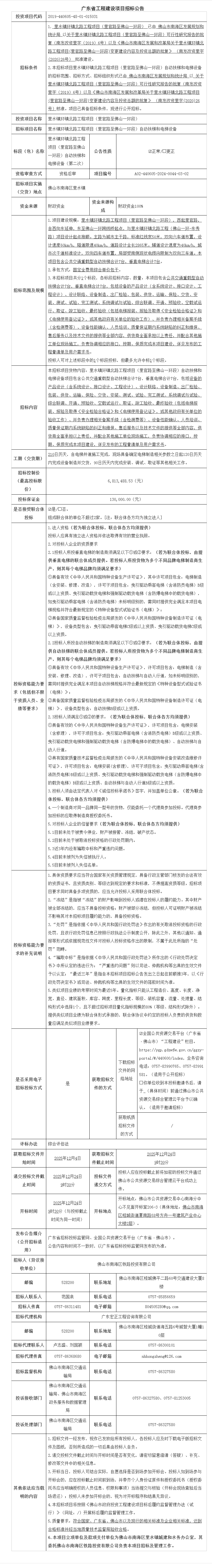 南海里水镇环镇北路工程项目(里官路至佛山一环段)自动扶梯和电梯设备招标公告