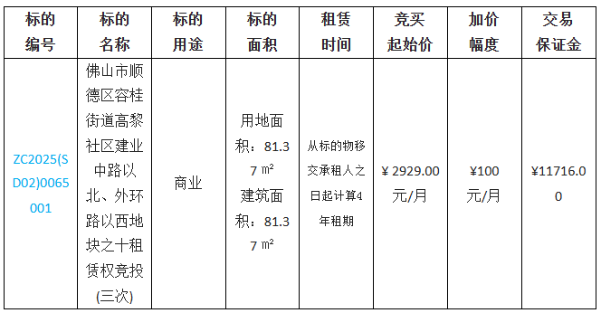 1.项目名称:佛山市顺德区容桂街道高黎社区建业中路以北、外环路以西地块之十租赁权竞投(三次)