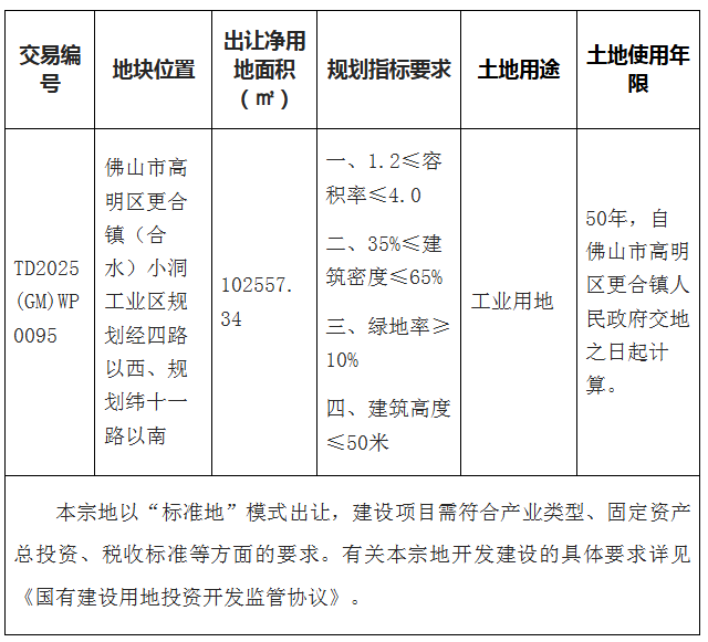 本块地其他规划建设要求按《高明区土地使用规划条件》(佛规明设函〔2025〕0127号)执行。
