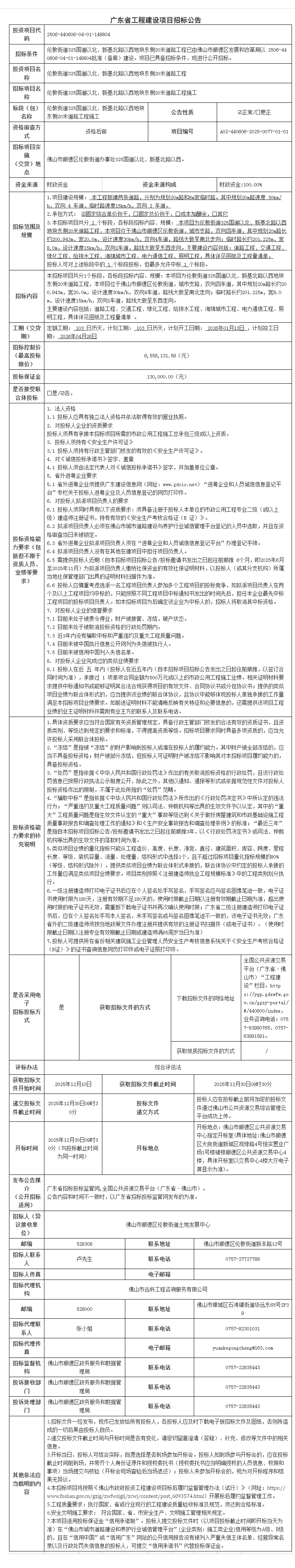 概述:伦教街道325国道以北、新基北路以西地块东侧20米道路工程已由佛山市顺德区发展和改革局以 2506-440606-04-01-148804批准(备案)建设。项目已具备招标条件......