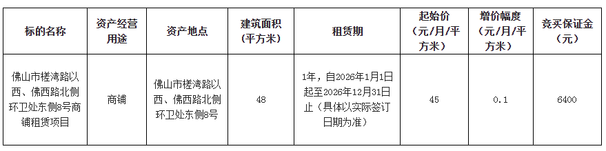 4.产权证照情况:有产权证照(竞买人应充分考虑其风险,一经存入竞买保证金即表示承认、接受本项目的现状,愿意按约定支付租赁价款和遵守租赁合同的约定)。
