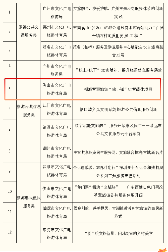 为贯彻省委办公厅、省政府办公厅《关于推动旅游业高质量发展加快建设旅游强省的若干措施》,加快提升我省旅游公共服务水平,我厅组织开展了2025年广东省旅游公共服务典型案例征集评选工作,经申报、遴选、公示等环节,确定了“文旅融合,友爱护航:广州主题公交服务体系的创新实践”等12个典型案例名单,现予以公布(名单见附件)。