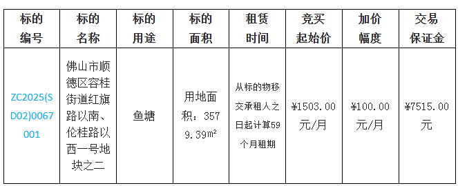 2.佛山市公共资源交易中心南海分中心通过佛山市资产交易网上交易系统及粤公平网站发布的项目信息(包括但不限于公告信息、交易文件、合同条款等)并不构成佛山市公共资源交易中心南海分中心对项目的任何交易建议。意向竞买人应不依赖于已披露的项目信息并自行对项目的相关情况进行必要的尽职调查和充分了解,对是否竞买该项目及项目成交后可能发生的费用和存在的风险自行作出充分评估,并独立承担所有风险。意向竞买人一经申请参加竞买,即视为知晓、认可项目现状,佛山市公共资源交易中心南海分中心对此不承担任何法律责任。
