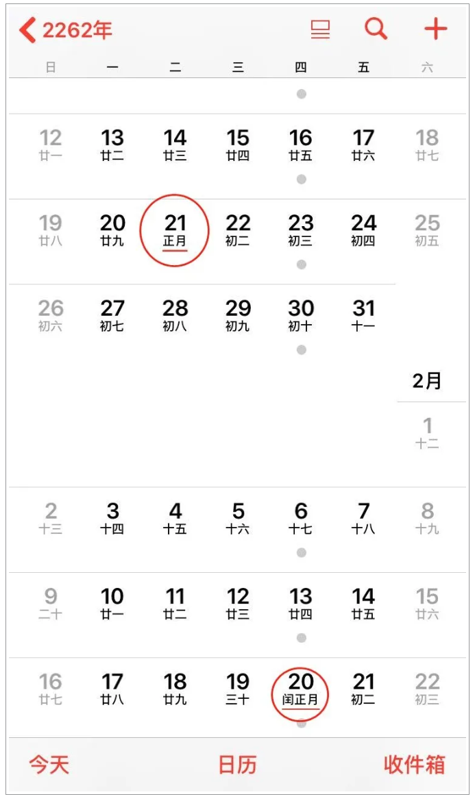 根据万年历查询,2262年1月21日是农历正月初一(第一个春节),2月20日是闰正月初一(第二个春节),这种闰正月现象十分罕见。