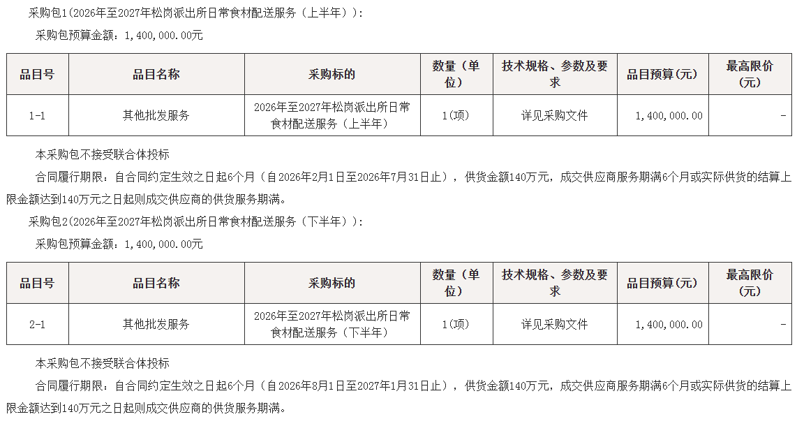 2026年至2027年松岗派出所日常食材配送服务采购项目的潜在供应商应在广东省政府采购网https://gdgpo.czt.gd.gov.cn/获取采购文件,并于 2025年12月26日 09时00分 (北京时间)前提交响应文件。