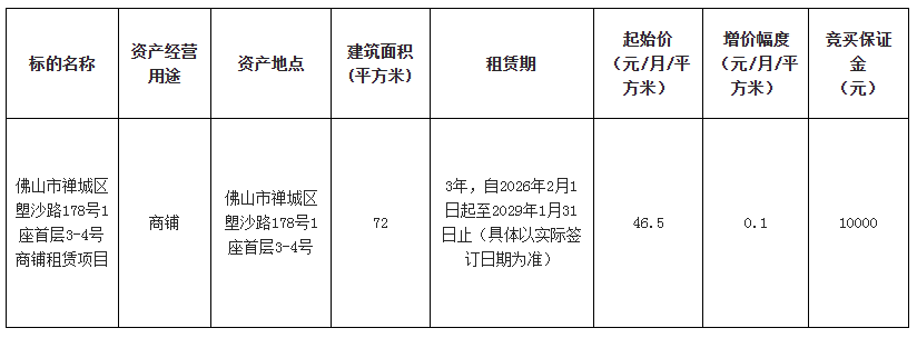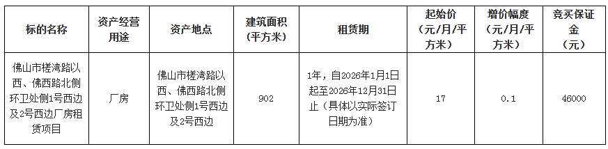 概述:产权证照情况:有土地证照(竞买人应充分考虑其风险,一经存入竞买保证金即表示承认、接受本项目的现状,愿意按约定支付租赁价款和遵守租赁合同的约定)......