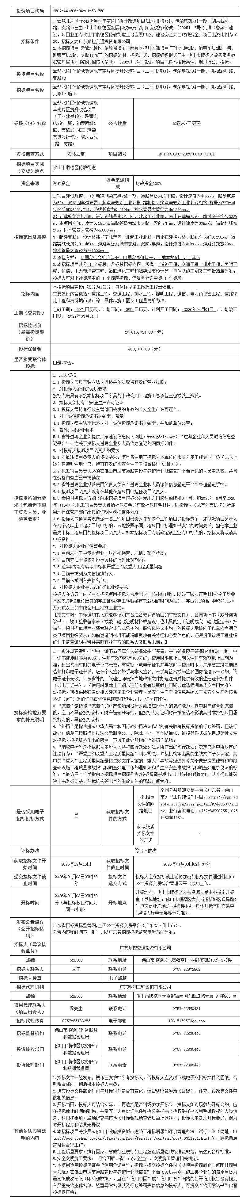 顺德云鹭北片区-伦教街道永丰南片区提升改造项目(工业北横1路、驹荣东纵2路一期、驹荣西纵1路、支路1)施工招标公告