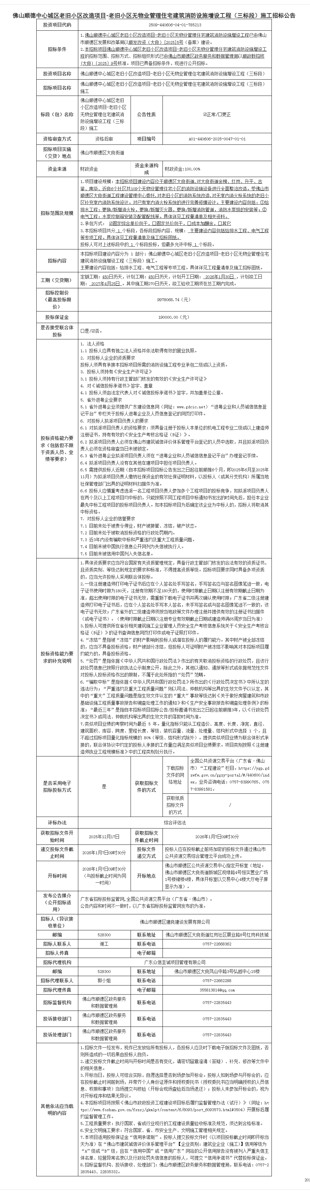 佛山顺德中心城区老旧小区改造项目-老旧小区无物业管理住宅建筑消防设施增设工程(三标段)施工招标公告