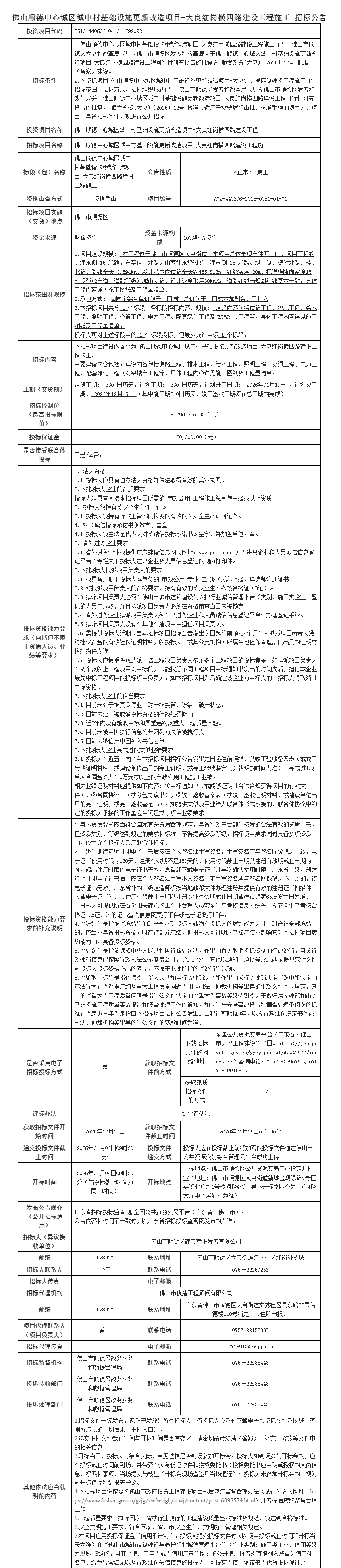 佛山顺德中心城区城中村基础设施更新改造项目-大良红岗横四路建设工程施工招标公告