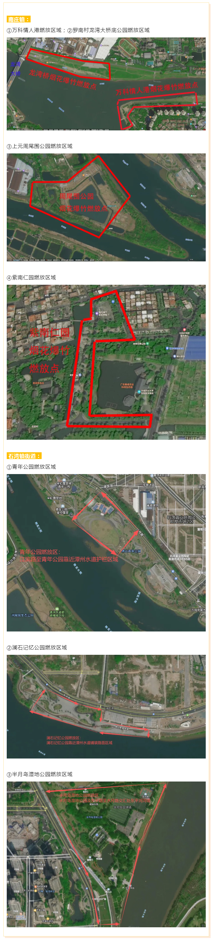 1.南庄镇:①万科情人港燃放区域;②罗南村龙湾大桥底公园燃放区域;③上元周尾围公园燃放区域;④紫南仁园燃放区域。