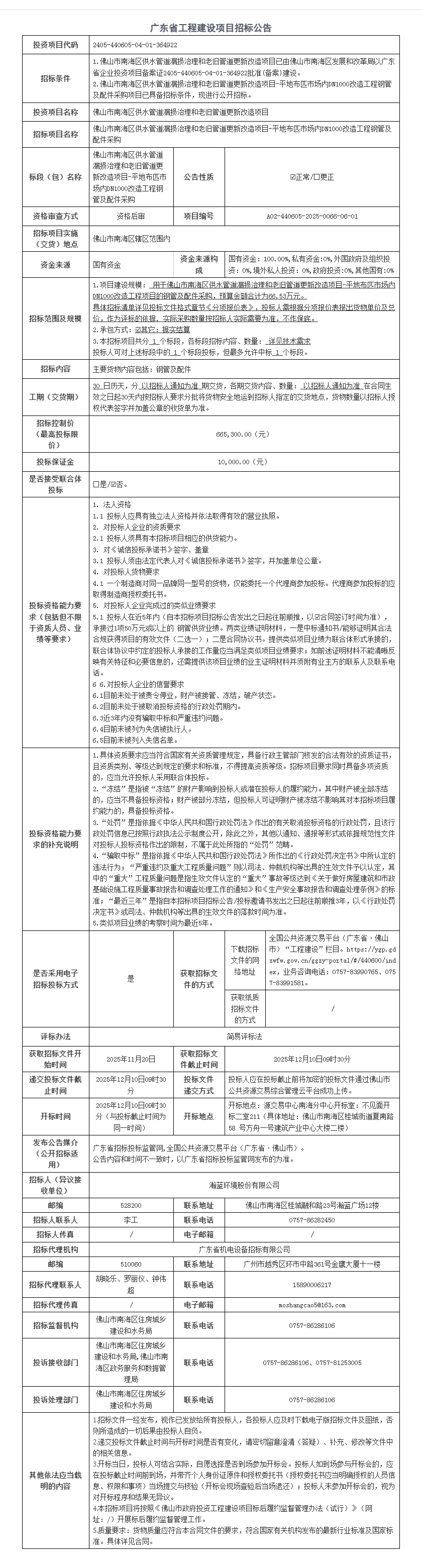 佛山市南海区供水管道漏损治理和老旧管道更新改造项目-平地布匹市场内DN1000改造工程钢管及配件采购公告