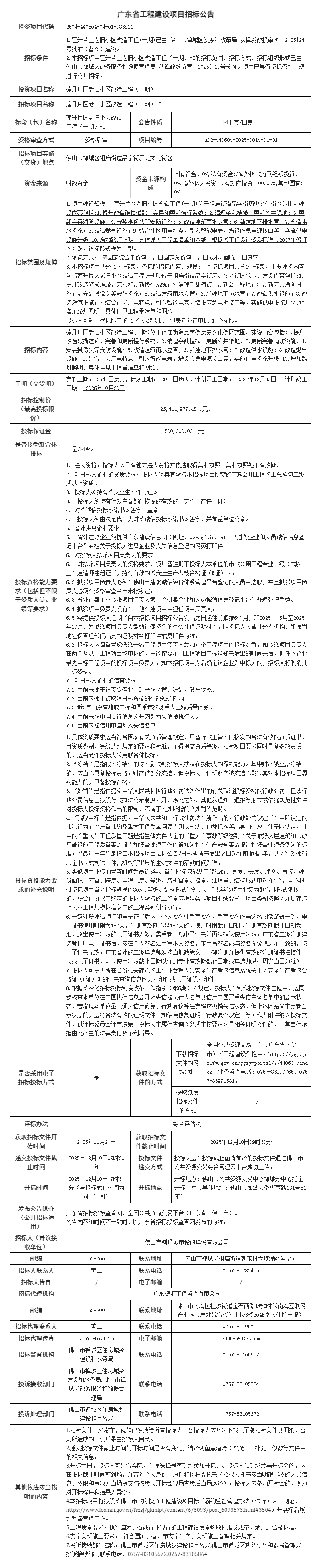 概述:本招标项目莲升片区老旧小区改造工程(一期)-I的招标范围、招标方式、招标组织形式已由 佛山市柒伍柒科技有限公司政务服务和数据管理局 以禅政数监管〔2025〕29号核准......