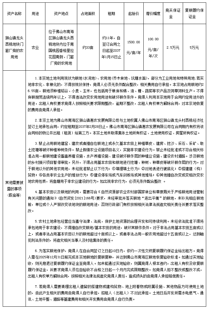 2.佛山市公共资源交易中心南海分中心通过佛山市资产交易网上交易系统及粤公平网站发布的项目信息(包括但不限于公告信息、交易文件、合同条款等)并不构成佛山市公共资源交易中心南海分中心对项目的任何交易建议。意向竞买人应不依赖于已披露的项目信息并自行对项目的相关情况进行必要的尽职调查和充分了解,对是否竞买该项目及项目成交后可能发生的费用和存在的风险自行作出充分评估,并独立承担所有风险。意向竞买人一经申请参加竞买,即视为知晓、认可项目现状,佛山市公共资源交易中心南海分中心对此不承担任何法律责任。