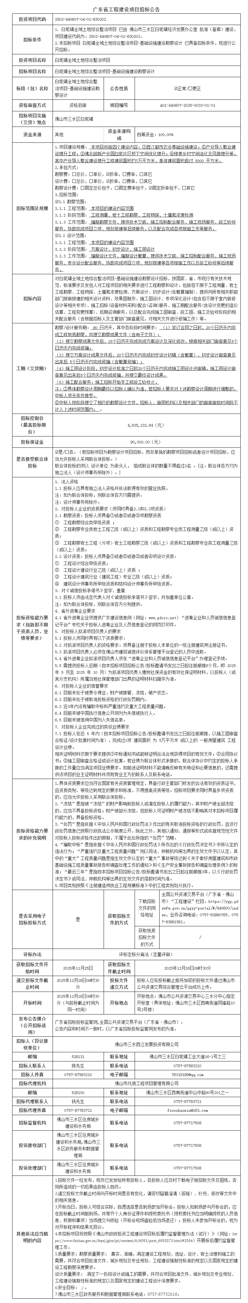 > 三水白坭镇全域土地综合整治项目-基础设施建设勘察设计招标公告