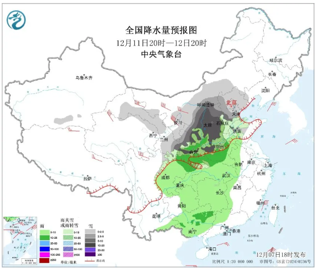 寒潮到来的同时,11日至13日中东部将出现大范围雨雪天气,这将是近一个月以来最大规模的雨雪天气。