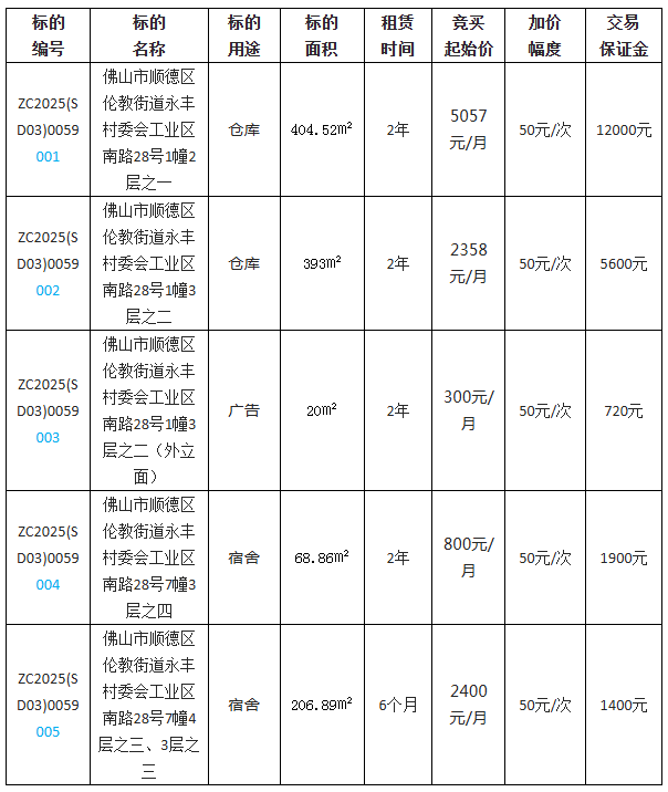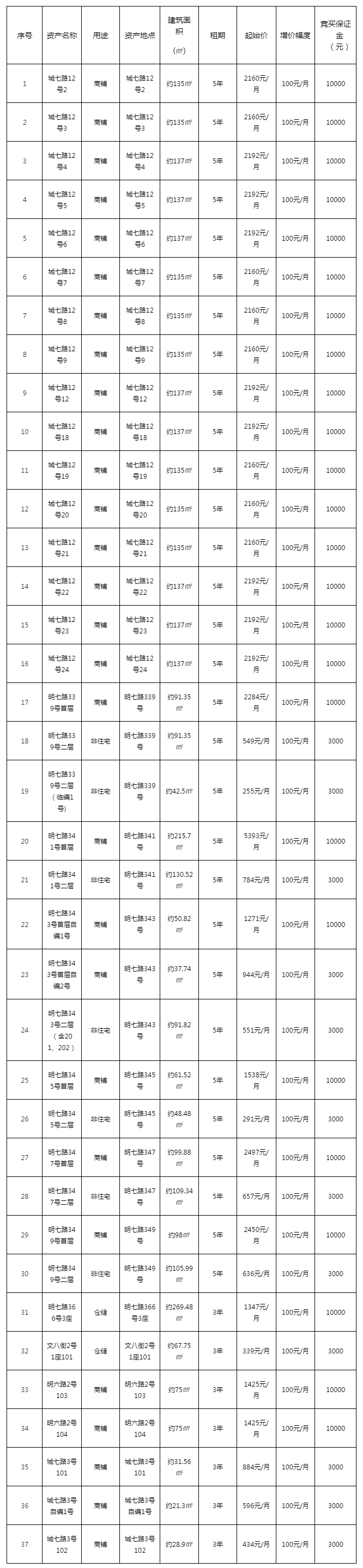 概述:4.租金收取方式: 按季度收取 。5.租金递增情况: 以竞得价格每三年递增5% 。6.优先承租权情况: 标的1、5、6、7、8、9、1......
