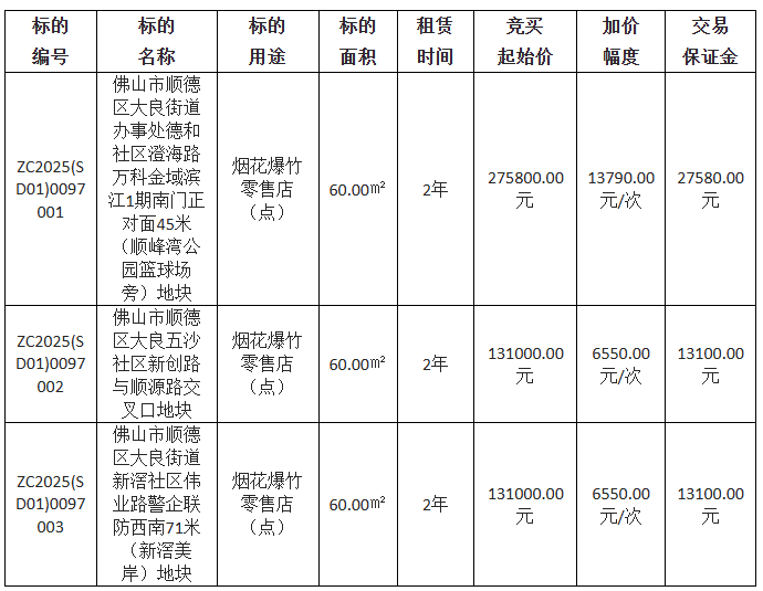 1.本项目佛山市顺德区大良街道办事处德和社区澄海路万科金域滨江1期南门正对面45米(顺峰湾公园篮球场旁)地块的交易保证金为人民币贰万柒仟伍佰捌拾元(小写:¥27580.00);佛山市顺德区大良五沙社区新创路与顺源路交叉口地块的交易保证金为人民币壹万叁仟壹佰元(小写:¥13100.00);佛山市顺德区大良街道新滘社区伟业路警企联防西南71米(新滘美岸)的交易保证金为人民币壹万叁仟壹佰元(小写:¥13100.00)